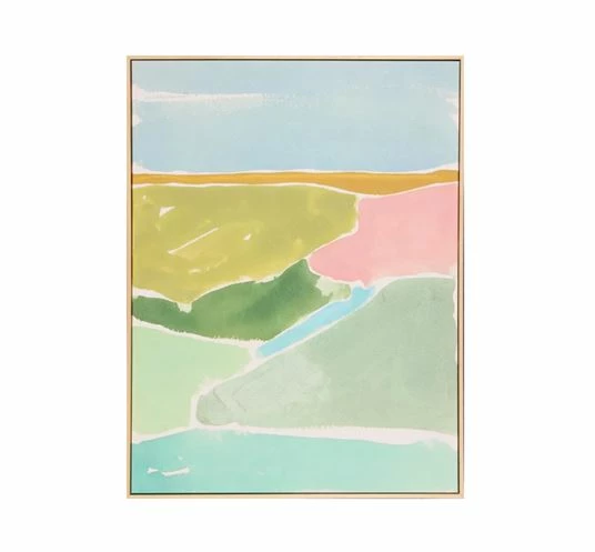 The fresh, clear palate of this abstract rendering of the Italian Landscape will carry you away with its dreamy quality. Framed in a streamlined natural wood that truly allows the art to shine. 24″W x 36″H